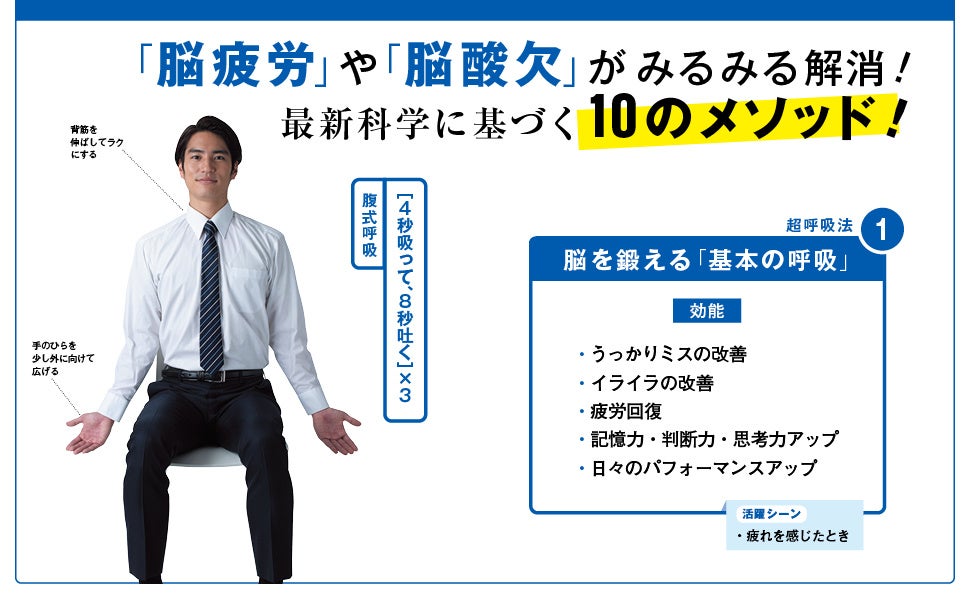 緊張をパッとほぐす「リラックス呼吸」、集中力を高める「戦闘モード呼吸」、やる気スイッチに「リセット呼吸」、朝スッキリ起きる「目覚め呼吸」、すやすや眠れる「安眠呼吸」、右脳の活性化に「クリエイティブ呼吸」、……など、お悩み別に、パフォーマンス向上に特化した10の呼吸法を紹介します