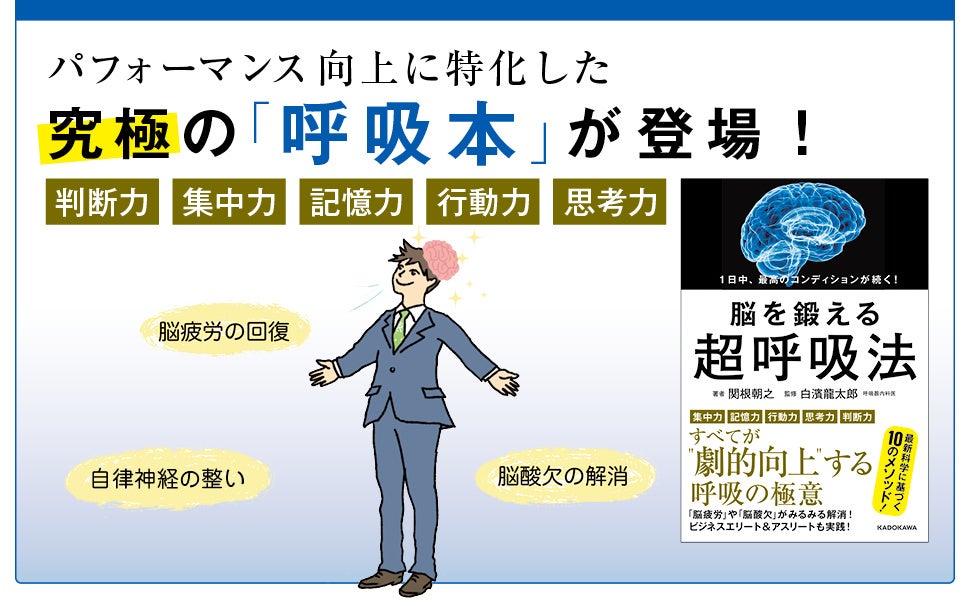 株式会社KADOKAWA(本社:東京都千代田区、代表取締役社長:夏野剛)は、著者・関根朝之氏、監修・白濱龍太郎氏によるビジネス実用書『1日中、最高のコンディションが続く! 脳を鍛える超呼吸法』を2022年8月1日(月)に発売いたします。